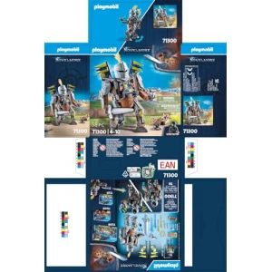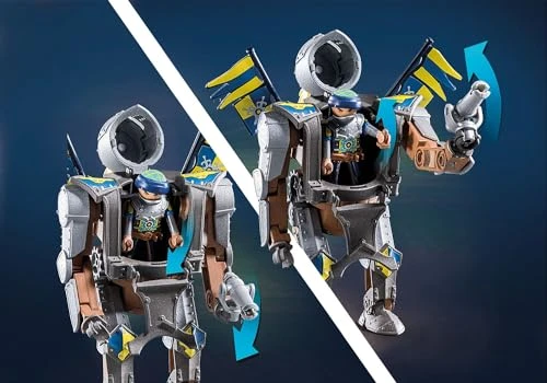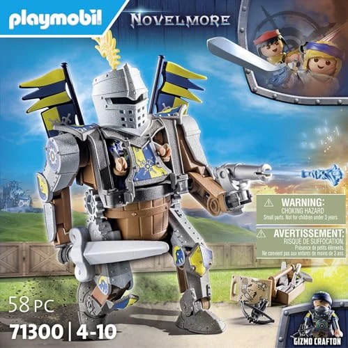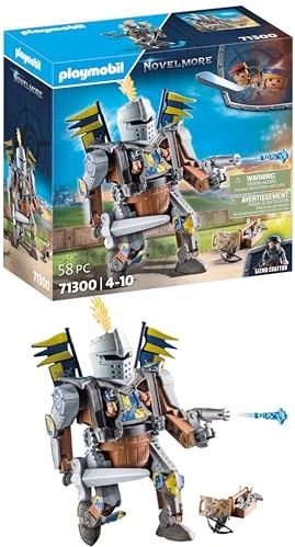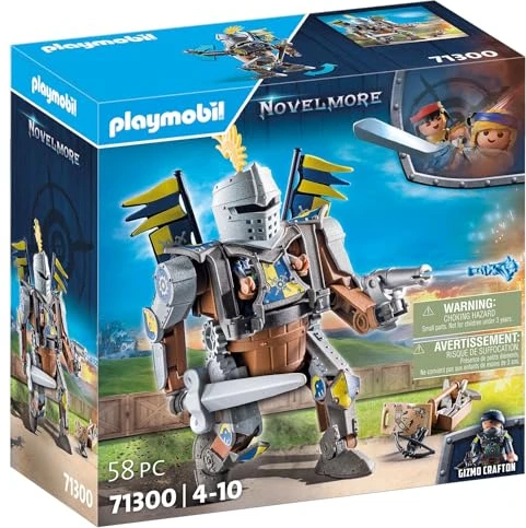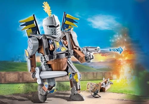 Au cœur de ce coffret, le Géant de Combat Novelmore se dresse fièrement. Cette imposante figurine, dotée d’une armure robuste, est articulée pour offrir une multitude de positions dynamiques. Ses bras, jambes et pieds mobiles permettent de simuler des mouvements réalistes, renforçant l’immersion dans les scènes de bataille. Le casque et le plastron se relèvent aisément, permettant d’insérer la figurine du chevalier Novelmore Gizmo Crafton à l’intérieur, qui prend alors le contrôle total du géant. (playmobil.com)