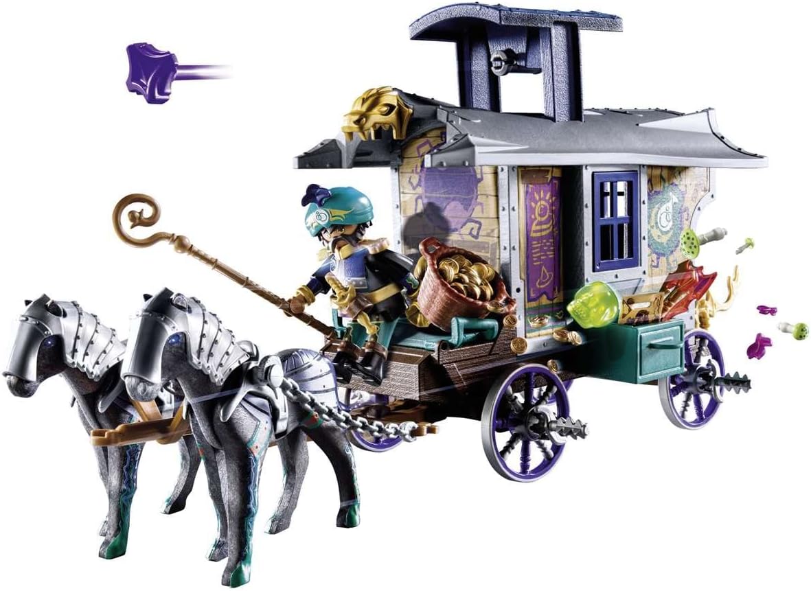 Le mage Arathor prend la route avec son chariot aménagé, prêt à explorer les territoires inconnus de Novelmore. Ce chariot n’est pas qu’un simple véhicule : il cache en son sein des fonctionnalités surprenantes. Avec une cachette secrète, vos enfants pourront imaginer des scénarios où le mage doit dissimuler des trésors ou des objets magiques, rendant chaque jeu unique.